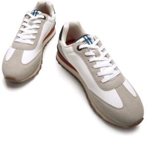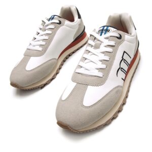 Zapatillas de color blanco para hombre de Mustang modelo Joggo Track, con estilo retro running y detalles en tonos beige, marino y naranja. Su diseño mezcla una base clara con contraste en la suela y bordes, aportando frescura sin perder el carácter deportivo. El logo lateral bordado, la puntera redondeada y la suela dentada completan una sneaker versátil. Incorporan una plantilla de 4 mm con tecnología Starfit, estas zapatillas ofrecen una pisada suave y cómoda. Su espuma Comfort Foam aporta un acolchado extra, ideal para disfrutar de un confort prolongado en cada uso.